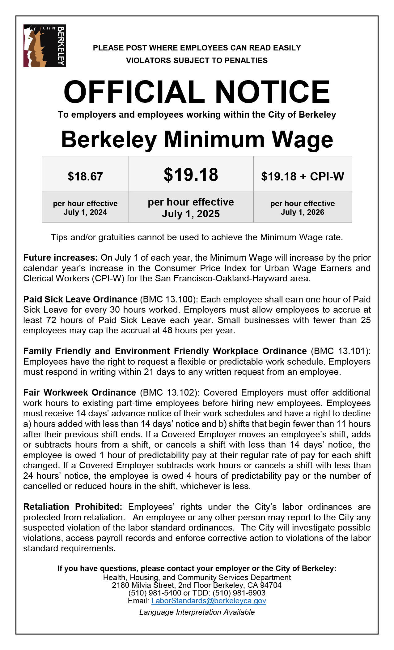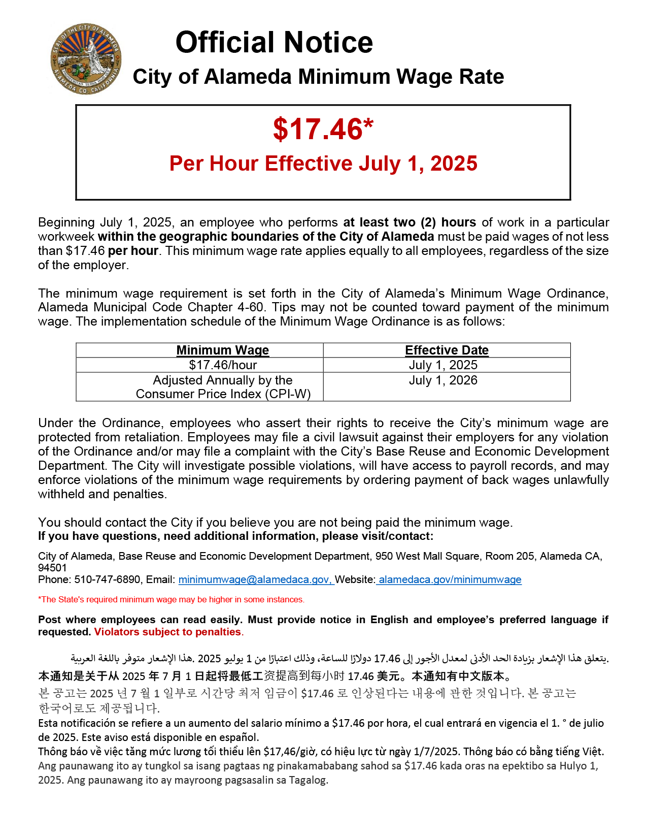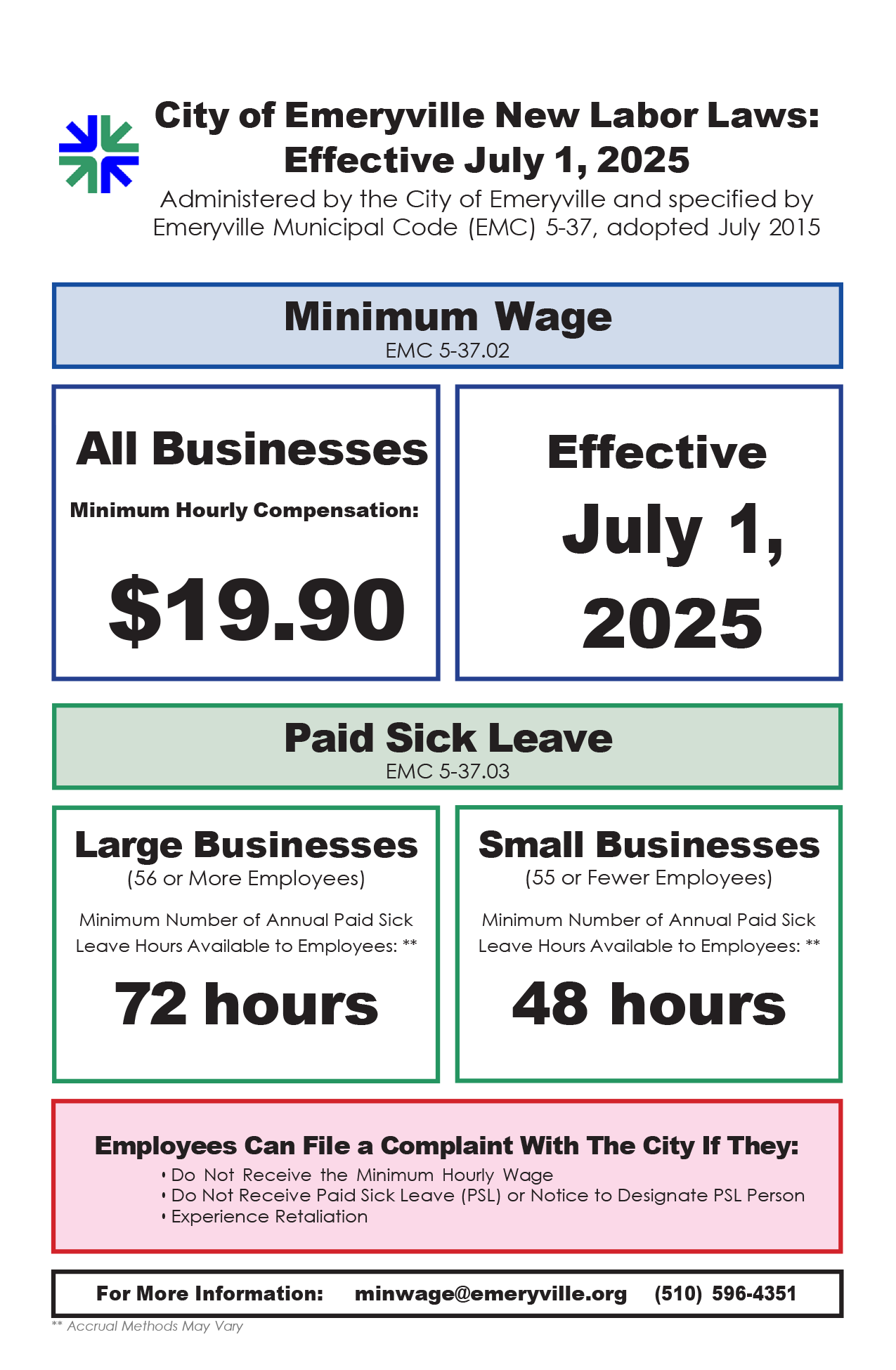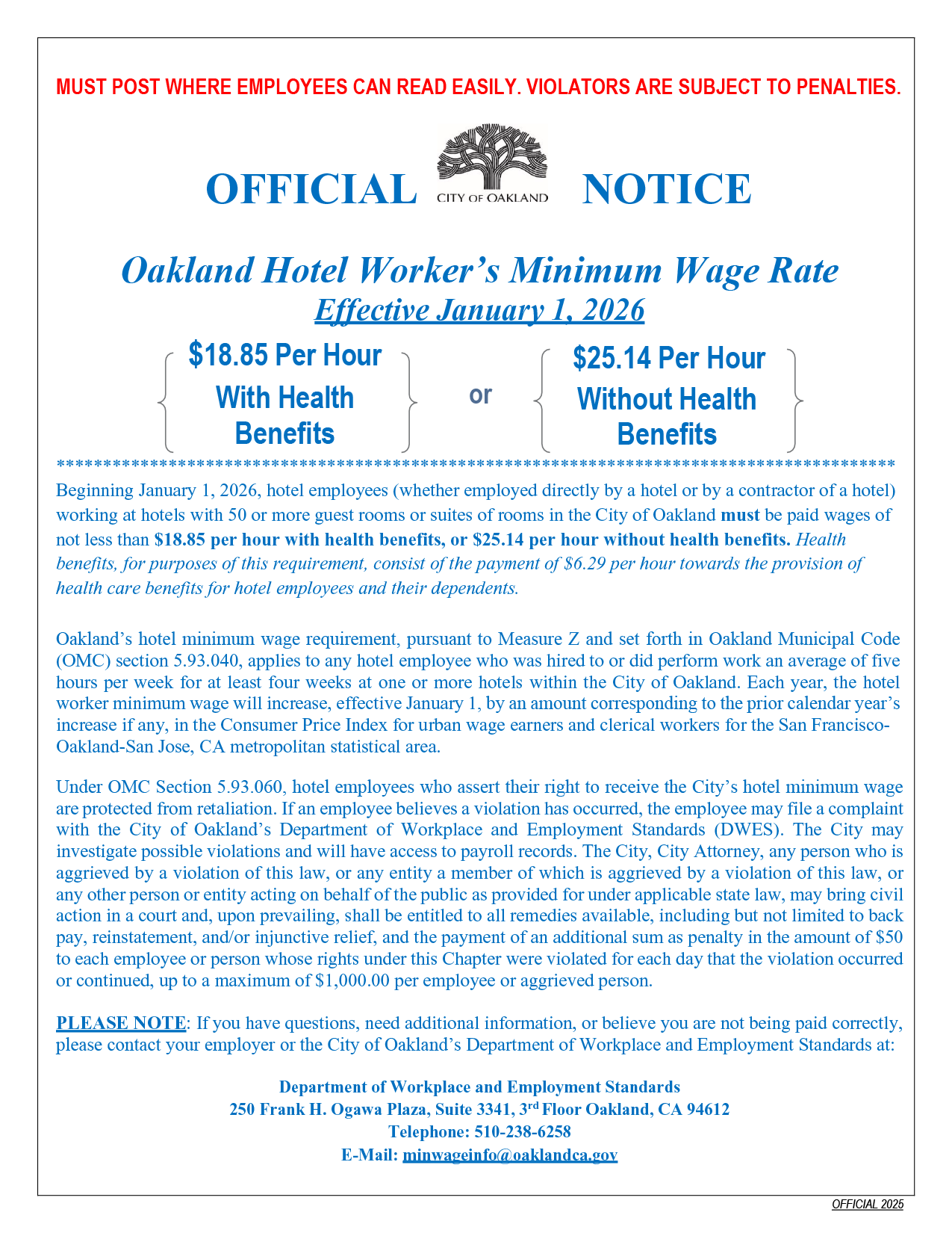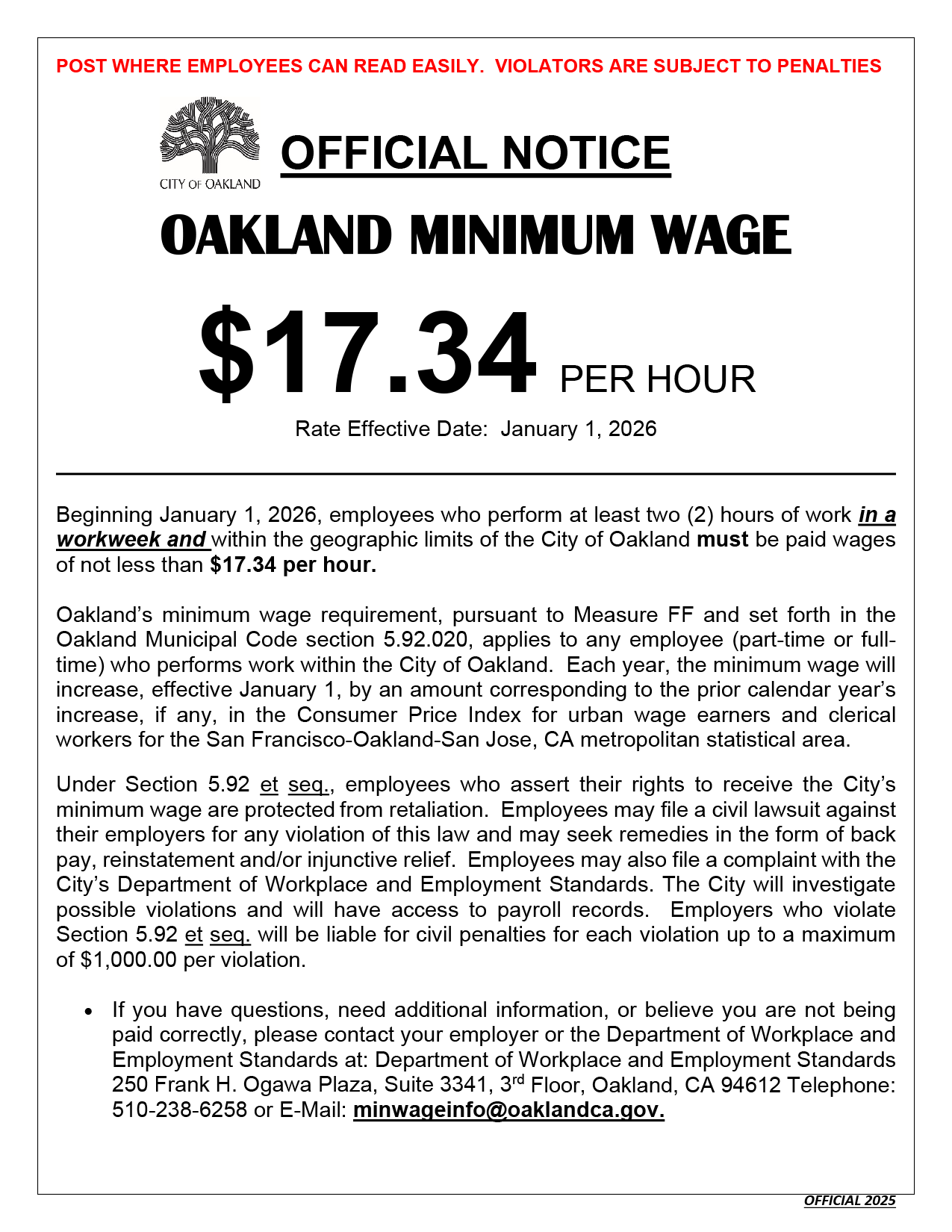 California Oakland City Municipal Code Poster (Minimum Wage; Paid Sick Leave; Service Charge)